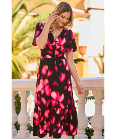 Black & Pink Floral Print Ruched Waist Fit & Flare Dress