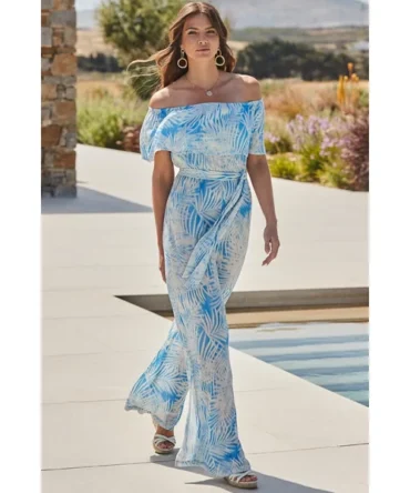 Red Floral Print Ruffle Detail Bardot Playsuit
