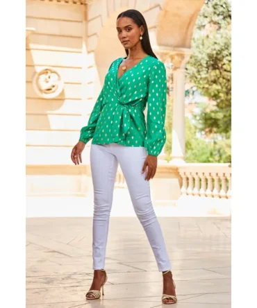 Green Metallic Fleck Print Blouson Sleeve Knot Front Top