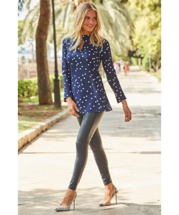 Navy & White Spot Print Keyhole Detail Fluted Cuff Top
