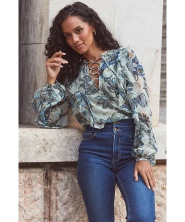 Petite Green Paisley Floral Print Lace Up Blouse