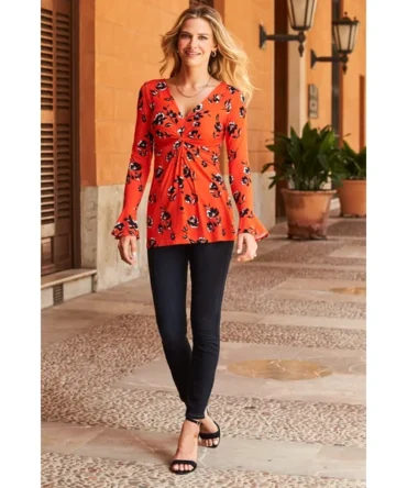 Red & Black Floral Print Twist Front Jersey Top