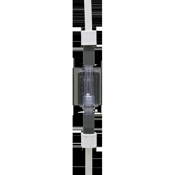 The 1/2″ Stenner flow indicator is a convenient visual reference, especially with black tubing, to confirm solution is pumping into the system. It can also provide an indication of common issues such as plugged injection point, ruptured or worn tubing, or empty solution tank, and assists with impeding backflow.