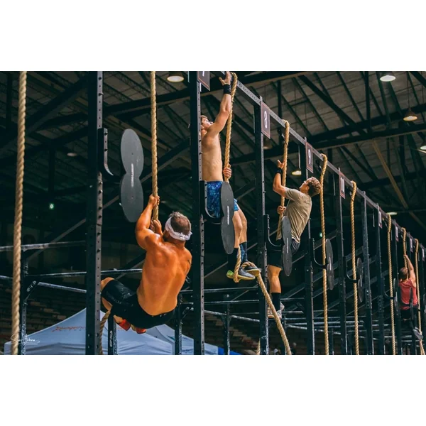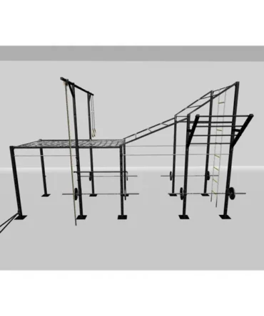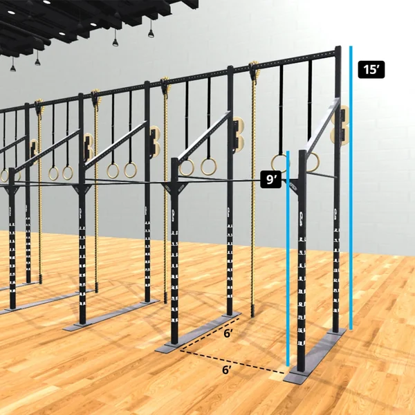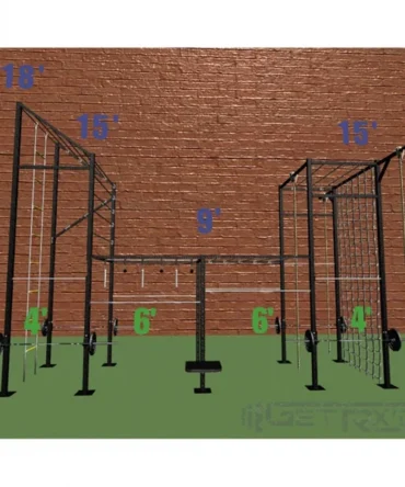 • 10x Square cross bars at 15′ height for attaching rings and climbing ropes