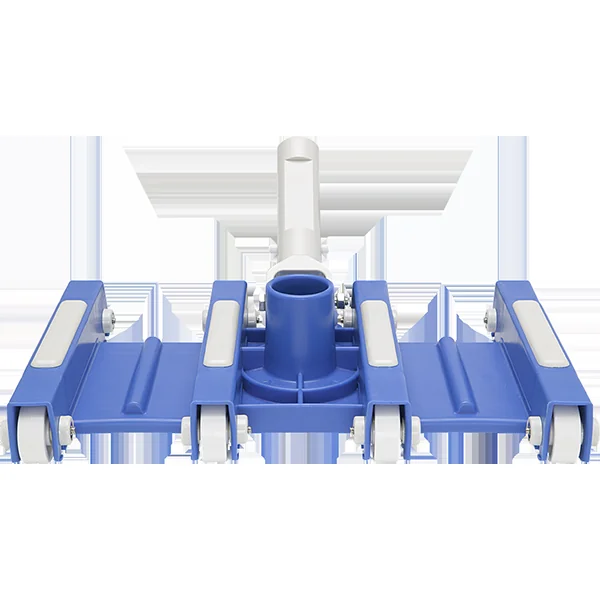 12″ flexible swimming pool vacuum head features polyethylene housing with enclosed weights, adjustable solid plastic wheels and a snap-adapt handle. Fits a 1 1/2″ vacuum hose only