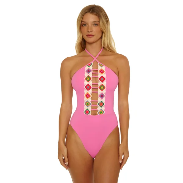 One piece swimsuit features a high neck and ladder tab cut out plunge front accented with crochet floral granny squares. Offers adjustable looped back straps with thread wrapped tassels and cheeky bottom coverage.