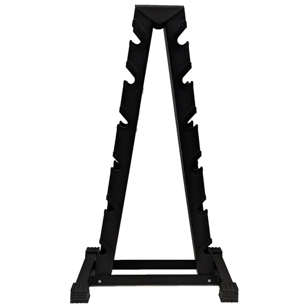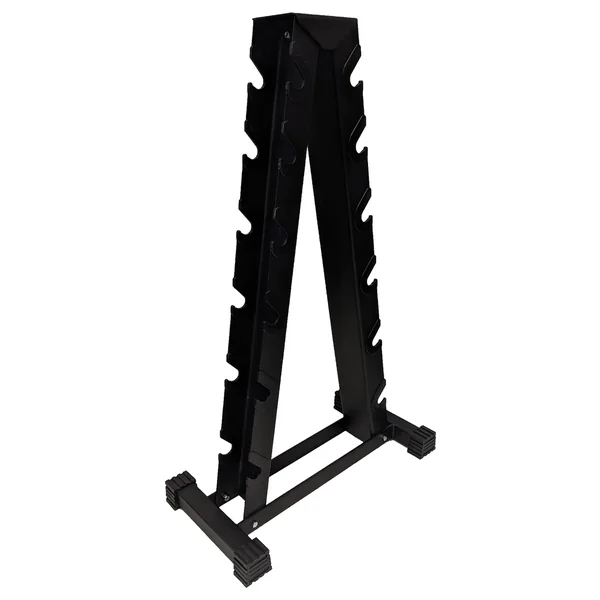 This 2-Sided A-frame dumbbell rack holds 6 pairs of dumbbells in an easy-to-access double sided format. The rack can hold Rubber Hex, Cast Iron, or Chrome, dumbbells ranging from 2.5 lb. to 30 lb. The space saving A-frame design helps to distribute the weight and the wide base pieces keep the stand from tipping. Plastic guards on the dumbbell rests cushion equipment and reduce noise. Plastic foot caps are featured to protect flooring and the black coating will complement any workout space.