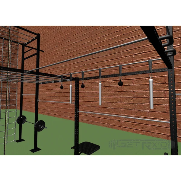 • Pull-up bars, square cross bars, and monkey bars adjustable in height from 6’2″ up to 9′ 12′, 15′, or 18′. They are all independent of one another.