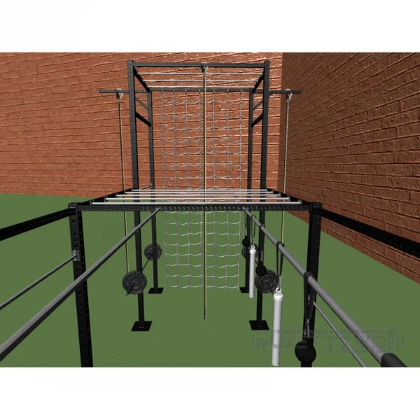 6th: After moving across the monkey bars, you climb down a 15′ x 6′ cargo net to complete the obstacle course!
