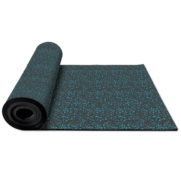 Start by rolling out the thick, smooth rubber flooring, then cut it to your desired size. Rolls come in various lengths with blue or gray speckles against a black background.