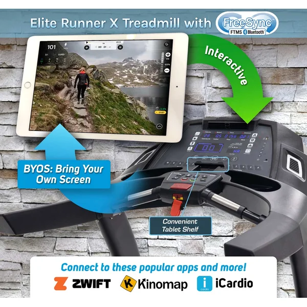 Enjoy an interactive experience by choosing different Play Store apps from Android™ and Apple ™ like Zwift™ or Kino Maps™ (some apps require monthly memberships) and let your tablet or mobile device become your fully functional, fully interactive electronic display. FreeSync™ allows your device to change elevation or resistance, send and receive workout data and best of all, if you get bored with an app from the Google Play Store or Apple Store, simply find a new app and move on!