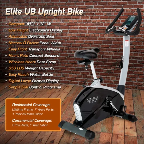 The 3G Cardio Elite UB Upright Bike features an incredibly comfortable, adjustable oversized seat which your backside will appreciate! Extremely well built with commercial grade components and a small compact overall length of 41”, the Elite UB Upright Bike will fit nicely into whichever room you choose. With a user weight capacity of up to 350 lbs. and a 7-year parts warranty, the Elite UB Bike will feel like you brought the health club home!