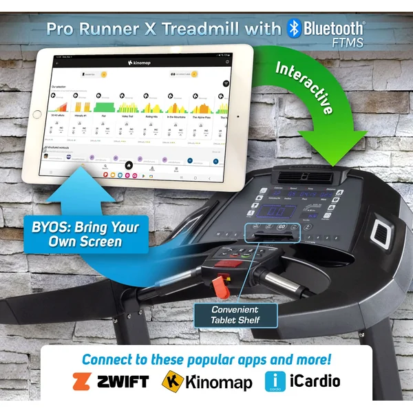 Enjoy an interactive experience by choosing different Play Store apps from Android™ and Apple ™ like Zwift™ or Kino Maps™ (some apps require monthly memberships) and let your tablet or mobile device become your fully functional, fully interactive electronic display.  FreeSync™ allows your device to change elevation or resistance, send and receive workout data and best of all, if you get bored with an app from the Google Play Store or Apple Store, simply find a new app and move on!