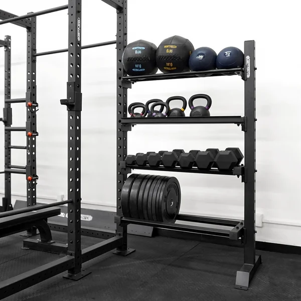 • Option to choose up to 5 different levels of shelves: Medicine ball shelf/bumper plate shelf, dumbbell shelf, or kettlebell shelf
