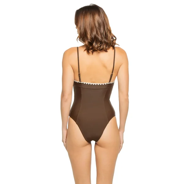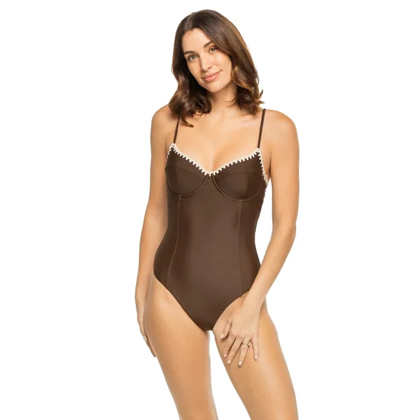 Addisyn one piece features beautiful crochet trim and offers supportive underwire, adjustable straps, and moderate bottom coverage.