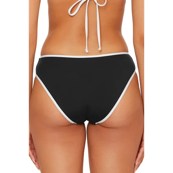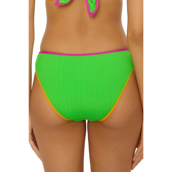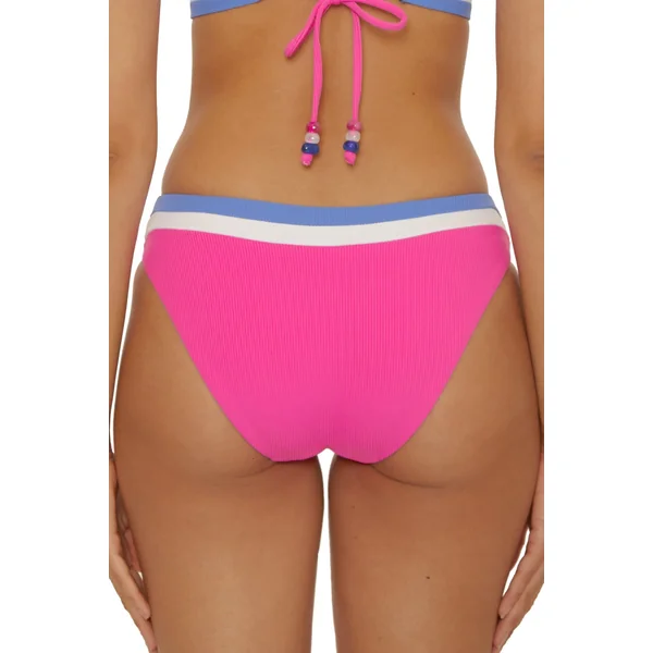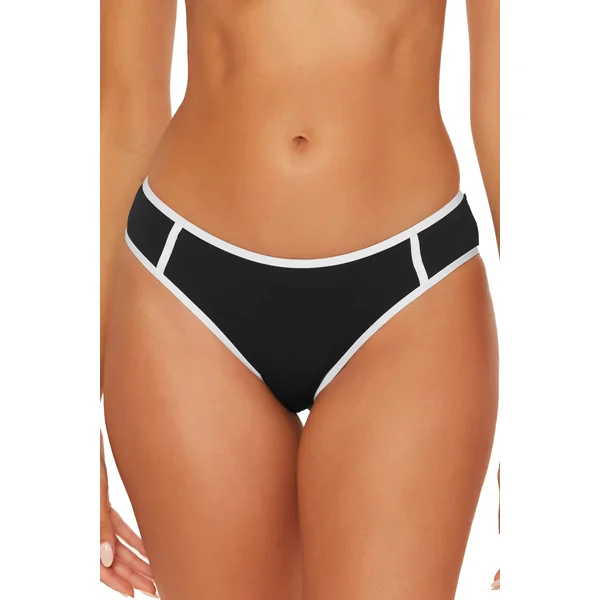 Bikini bottom features textured fabric and color block detailing. Offers moderate coverage.