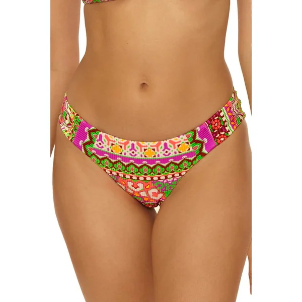 Ribbed bikini bottom features medallion tile print and offers a cinched back and moderate bottom coverage.