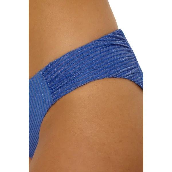 Bikini bottom features rib textured fabric with metallic detail, shirred sides, cinched back and moderate coverage.