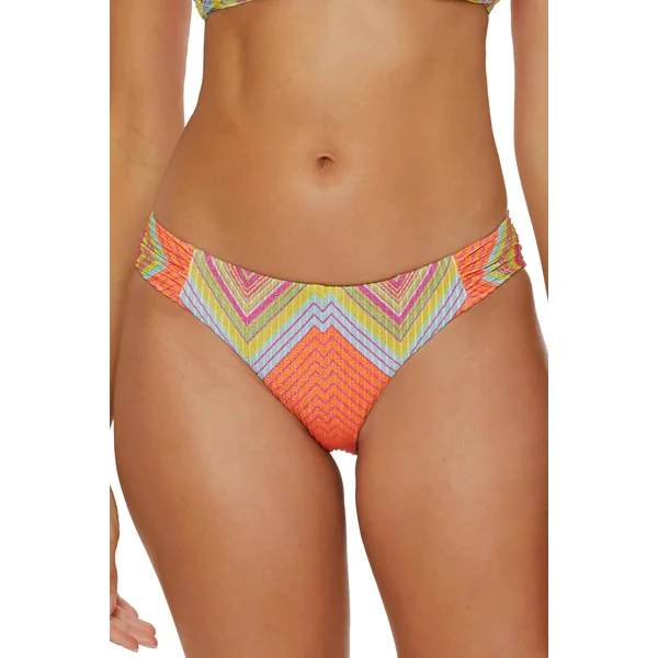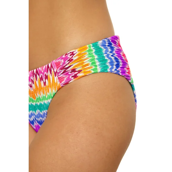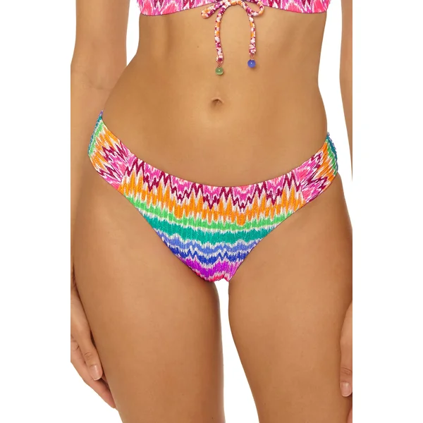Bikini bottom features zig-zag printed ribbed fabric with metallic detail and offers a cinched back and moderate bottom coverage.