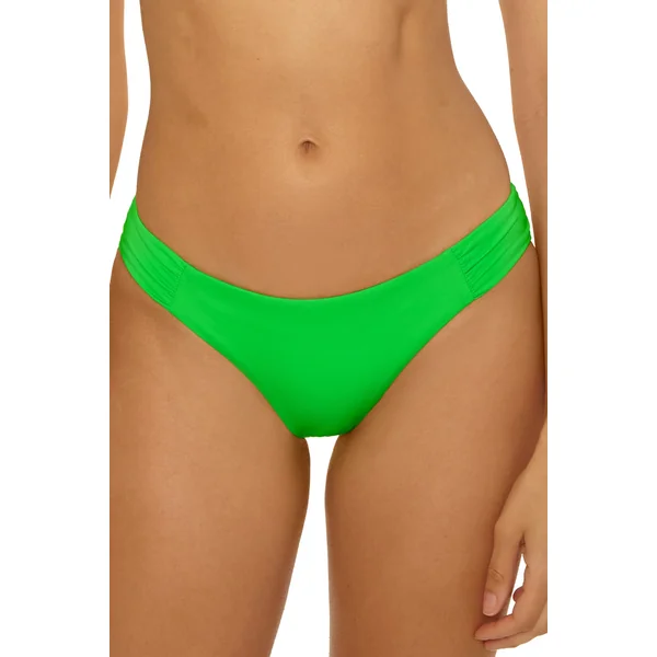Bikini bottom features shirred tab sides, cinched back and moderate bottom coverage.