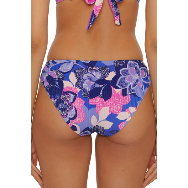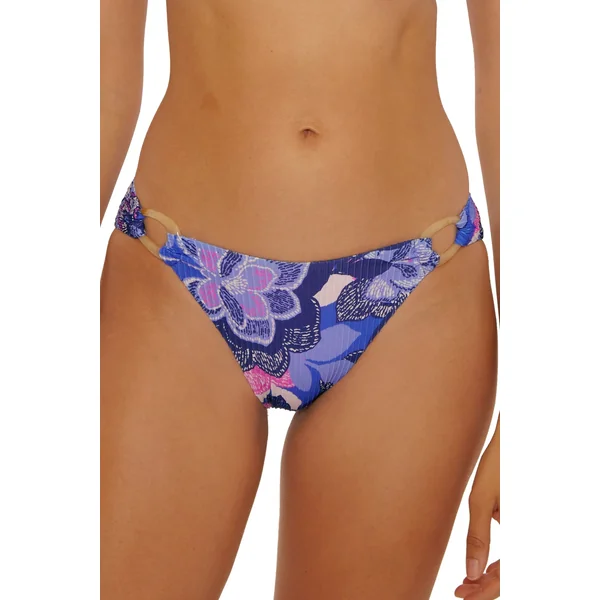 Rib textured bikini bottom features shimmer detailed floral print, ring accent the hips, and moderate coverage.