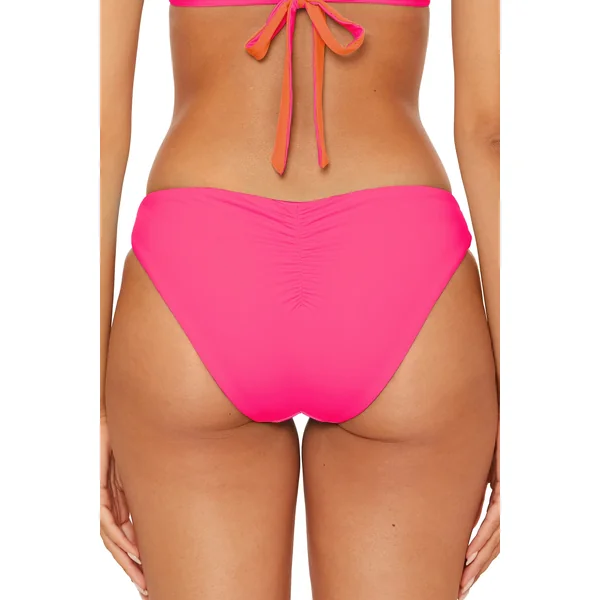 Adela hipster bikini bottom features reversible fabric, a cinch back and moderate coverage.