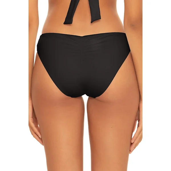 Adela hipster bikini bottom features shirred back and offers moderate coverage.