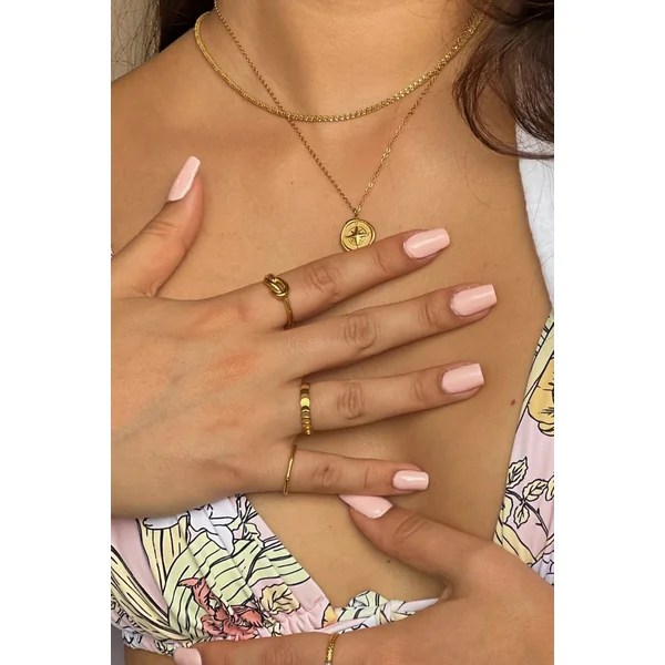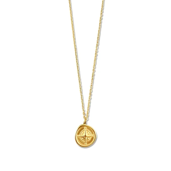 Aerin necklace is water resistant and made from gold-plated hypoallergenic stainless steel. It features a dainty chain with a compass pendant and is secured with a lobster clasp closure.