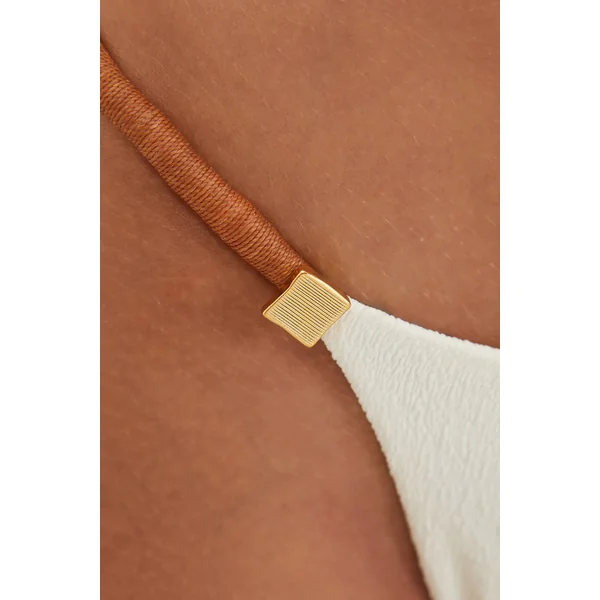 Aika bikini bottom features textured fabric and tab sides crafted with caramel waxed threads and gold-plated details. Offers minimal coverage.
