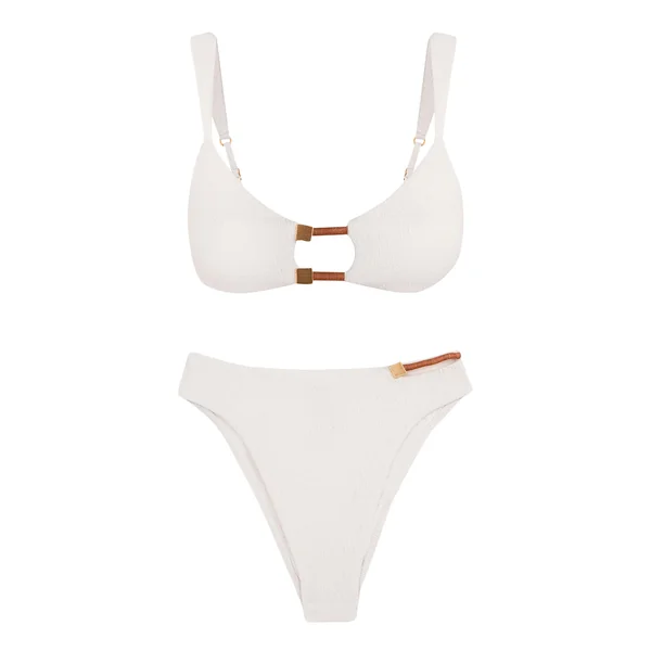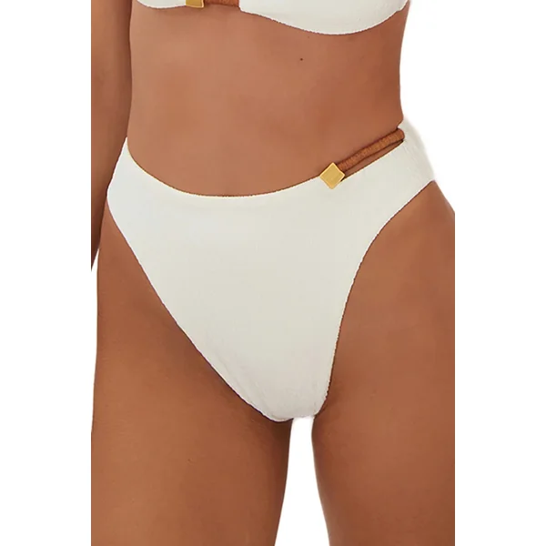 Aika textured bikini bottom adorned with caramel wax threads and gold-plated details Offers cheeky coverage.
