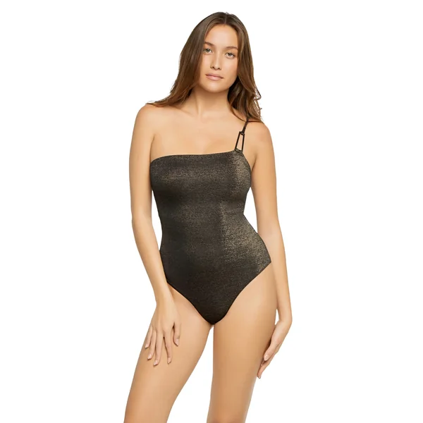 One piece swimsuit features textured shimmer fabric and one shoulder strap with a rectangular hardware detail. Offers an adjustable strap and moderate bottom coverage.