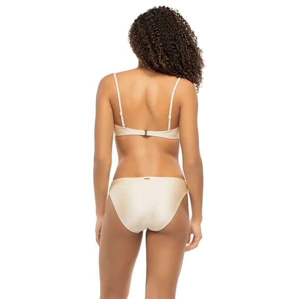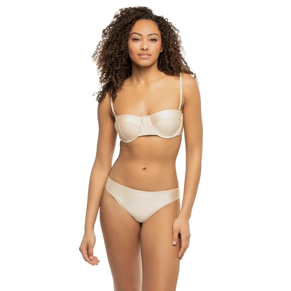 Alexandria bikini top features structured cups with supportive underwire and removable soft cups. Offers adjustable convertible straps and a hook back closure.