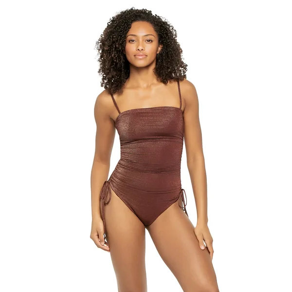 One piece swimsuit features textured shimmer fabric, shirring and adjustable drawstring sides to adjust leg height. Offers adjustable straps and moderate bottom coverage.