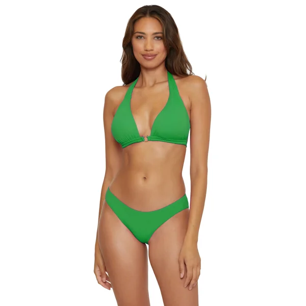 Allie sliding halter bikini top features a gold mini horseshoe hardware detail. Offers removable soft cups, double under bust ties for additional support, adjustable neck and back ties.