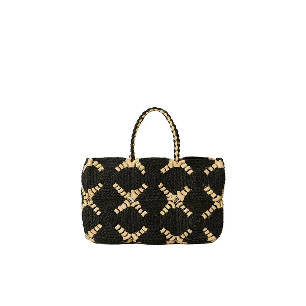 Aloha tote features woven straw with a distinctive x-pattern design.