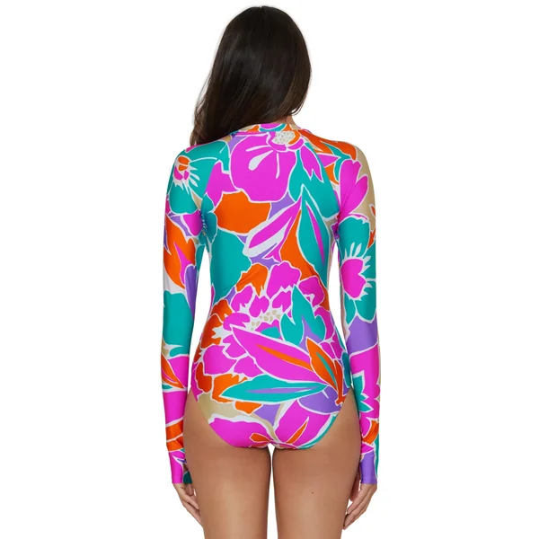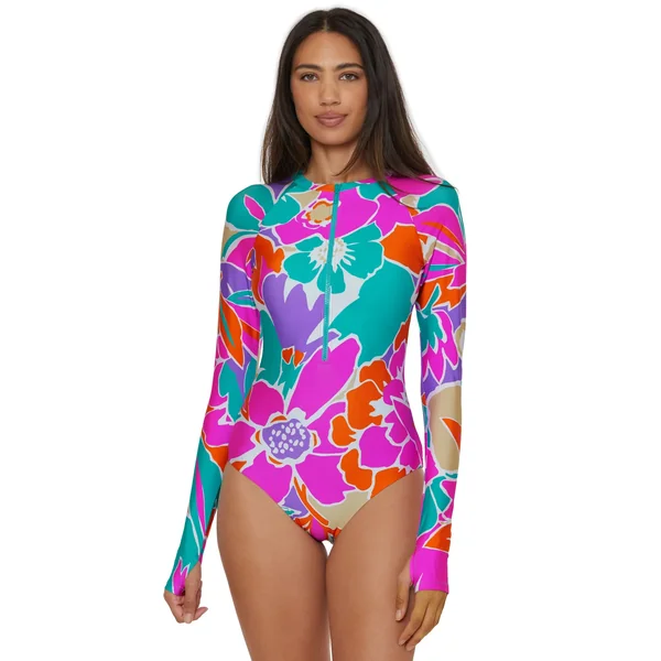 Paddlesuit features bright floral print and long sleeves. Offers a zipper front and moderate bottom coverage.