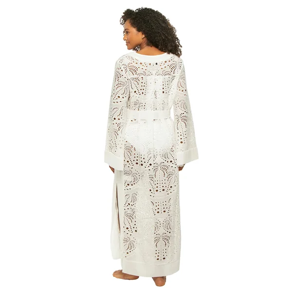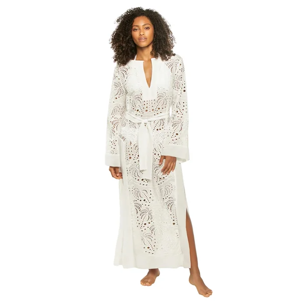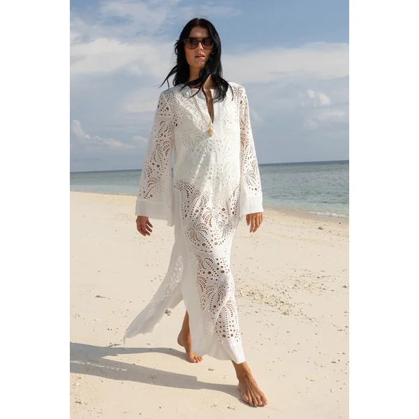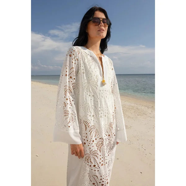 Amara maxi dress is embellished with English embroidery featuring palm tree motifs and offers a split neckline, long sleeves and side slit.