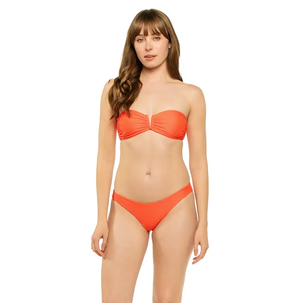 Bikini top features shirred detailed cups, front v-wire accent, and offers a clasp back closure.