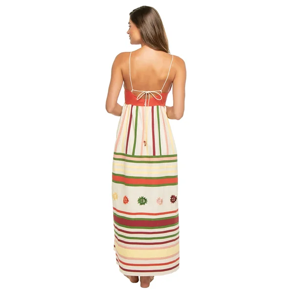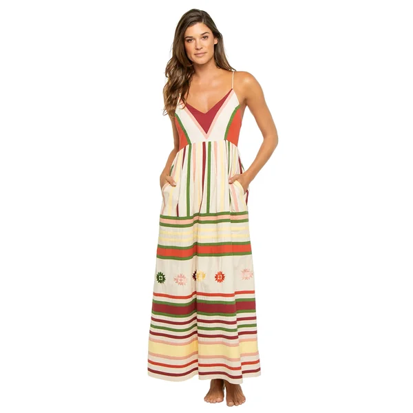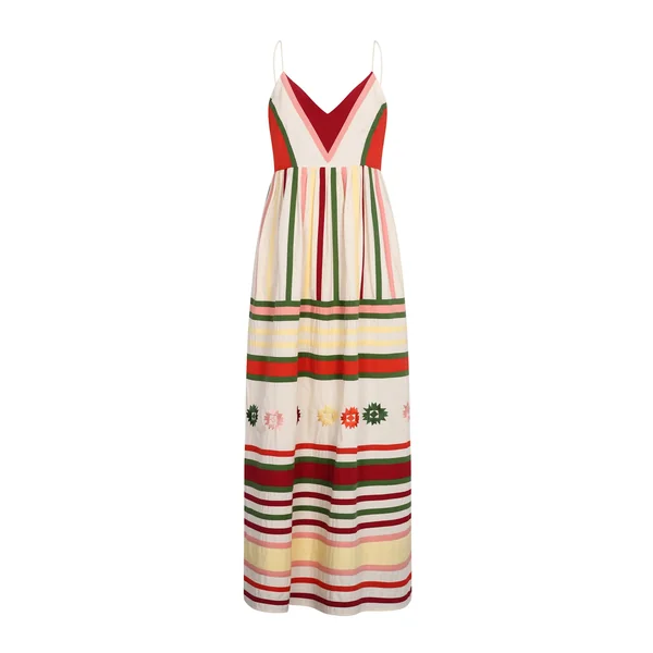 Amelia dress features a stripped pattern with embroidered appliques, v-neckline and spaghetti straps that adjust and tie in the back. It also includes side seam pockets.