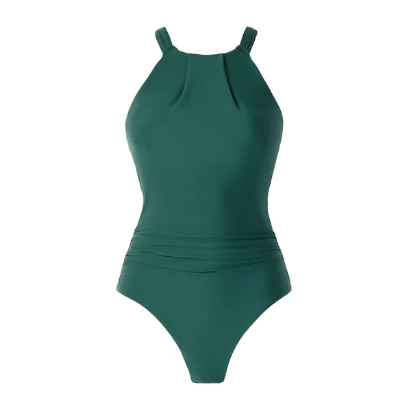 Amelia one piece swimsuit features a high neckline with soft pleats and an open back with tie closure at neck. Offers hidden underwire support and full bottom coverage.
