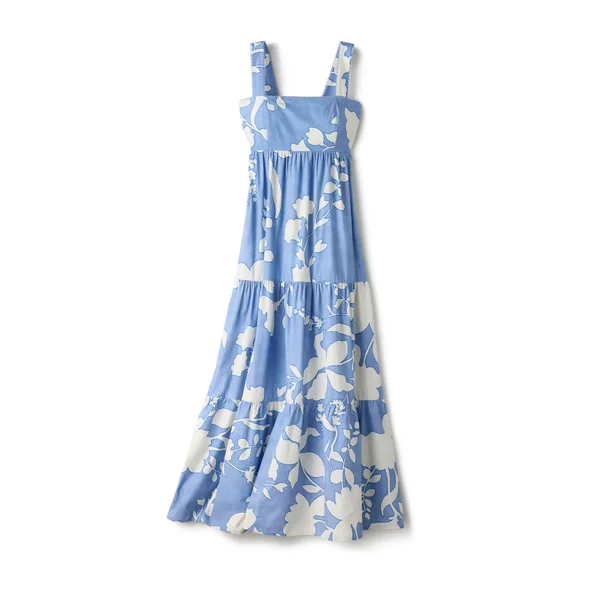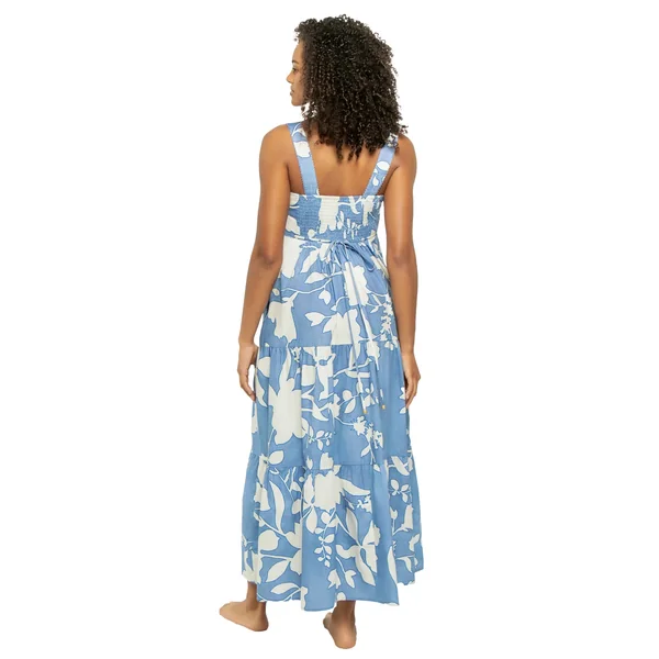 Maxi dress features wide shoulder straps with picot trim, empire waist and tiered ruffle skirt. Offers convenient pockets, smocked back for an easy pullover fit and a back tie to cinch the waist.