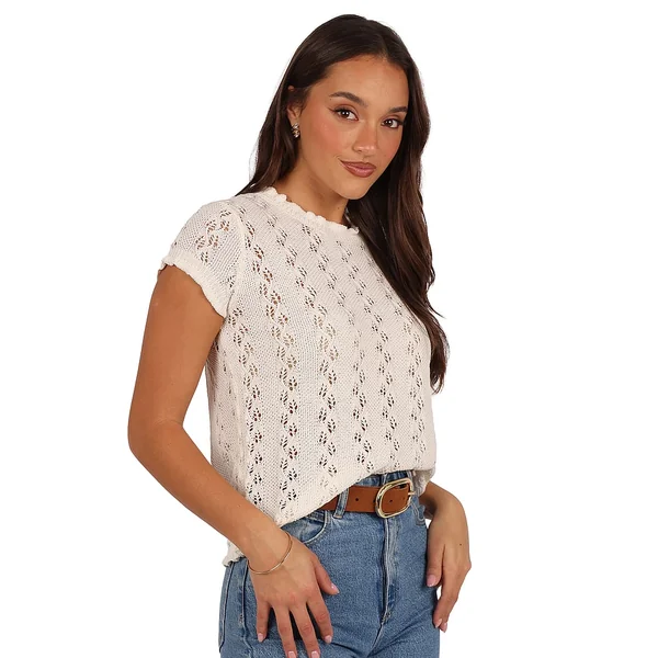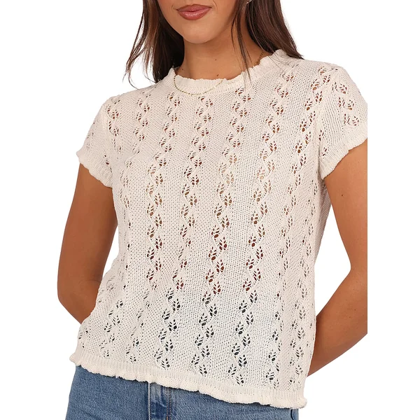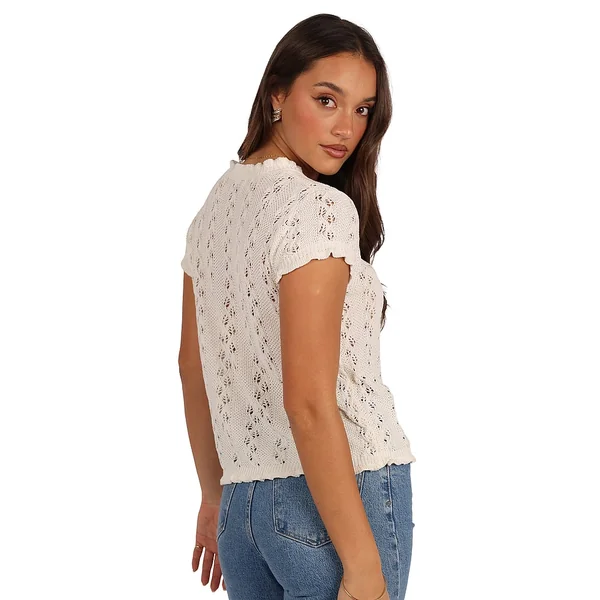 Delicate ruffle trim and sweet open-knit details give this chic Top an ultra-feminine feel. It pairs perfectly with Jeans and Boots (and adventures kissed by a late summer breeze).