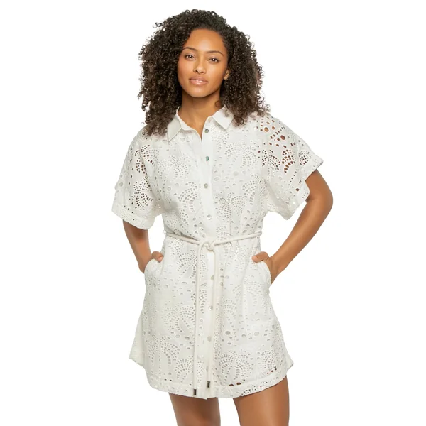 Anglaise mini dress features embroidery using eyelets to create a tropical palm pattern and offers a button-up collared neckline, short sleeves and removable waist tie with metal ends.