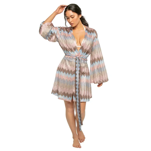 Caftan features zig-zag striped print, long bell sleeves, and offers a removable waist tie.