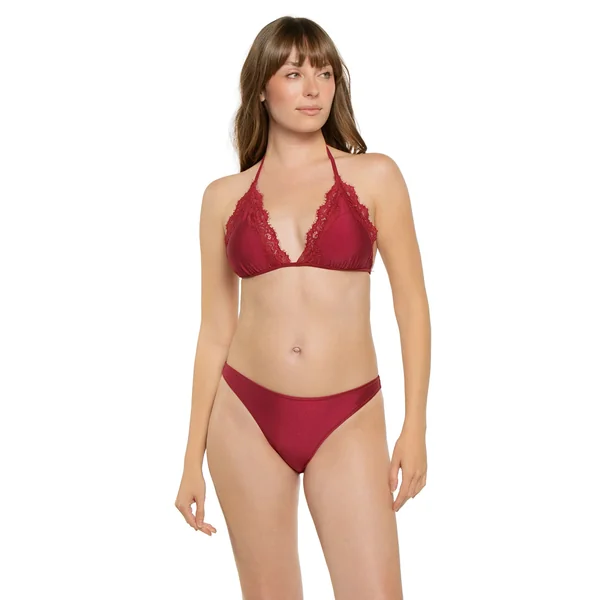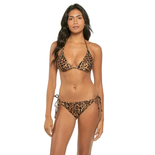 Triangle bikini top features lace trim and adjustable neck and back ties adorned with gold cord ends.