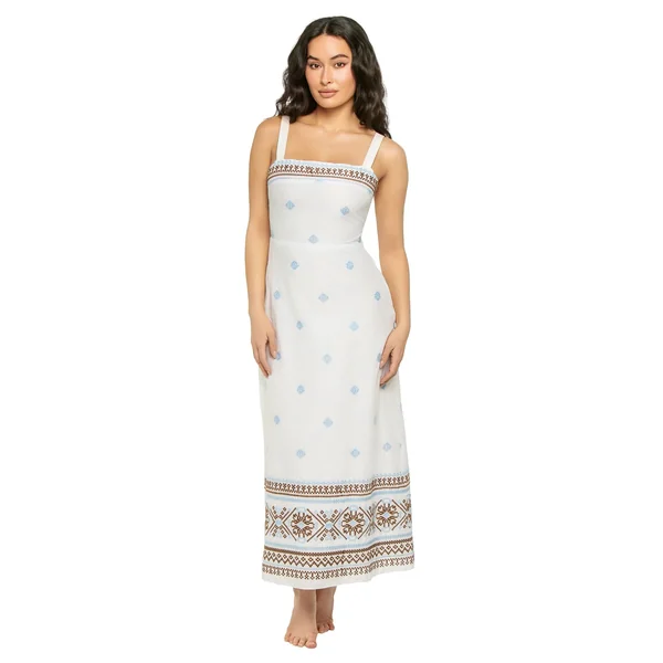 Midi dress features embroidered accents, adjustable straps and smocked back for a comfortable fit.