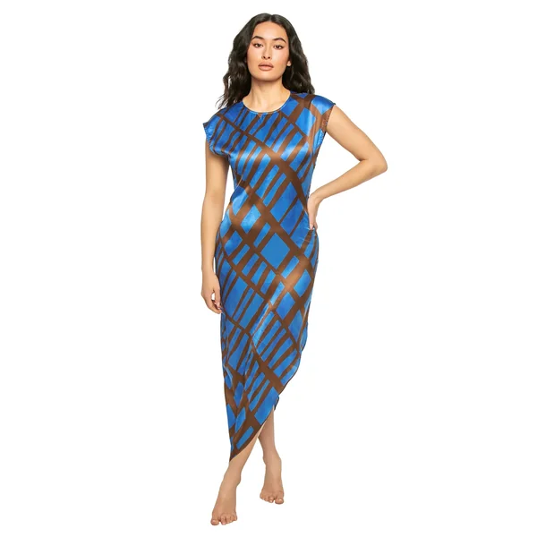 Midi dress features short cap sleeves, asymmetrical hem and a button closure at back.