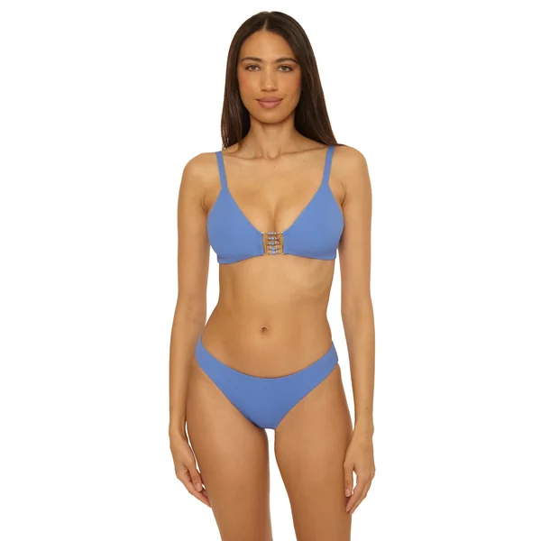 Ribbed bikini top features textured fabric, a deep v-neckline with beaded hardware accent. Offers removable soft cups, adjustable straps and a tie back.
