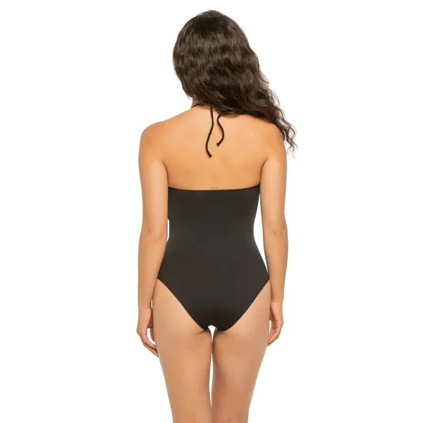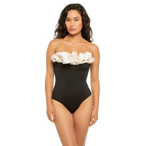 One piece swimsuit features ruffle neckline, removable halter strap, and cheeky bottom coverage.