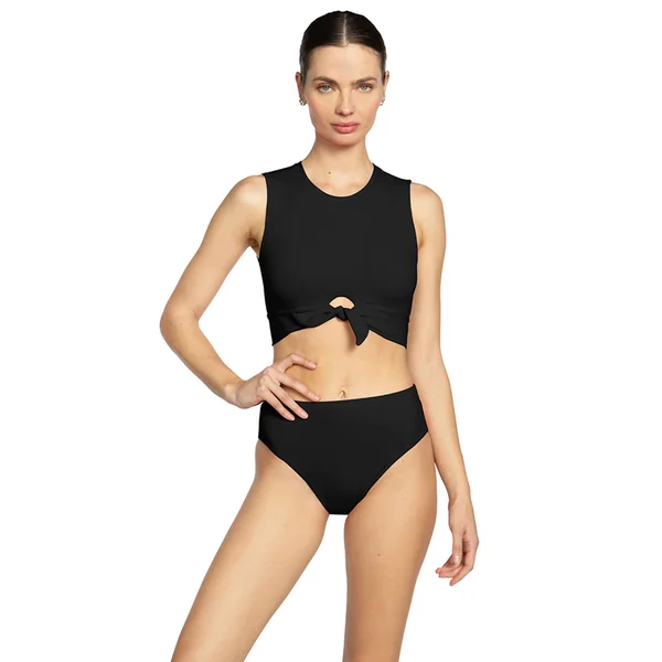 Tank-inspired bikini top feature a high neckline and front tie with keyhole detail.